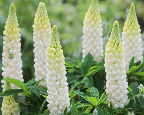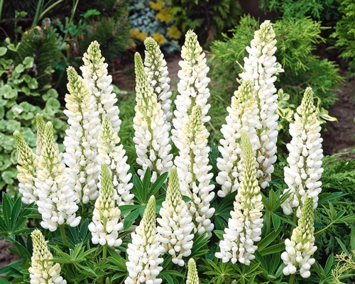 LUPINUS PERENNIS ‘NOBLE MAIDEN’ je elegantná trvalka s typickým vzpriameným habitom a výraznými kvetnými klasmi. Vytvára husté trsy dlaňovito delených, sviežo zelených listov, nad ktorými sa koncom jari objavujú čisto biele kvety usporiadané v dlhých, pevných klasoch. Kvitnutie pôsobí veľmi čisto a kontrastne, pričom rastlina vynikne najmä v kombinácii s farebnejšími trvalkami alebo v jemne ladených kompozíciách.