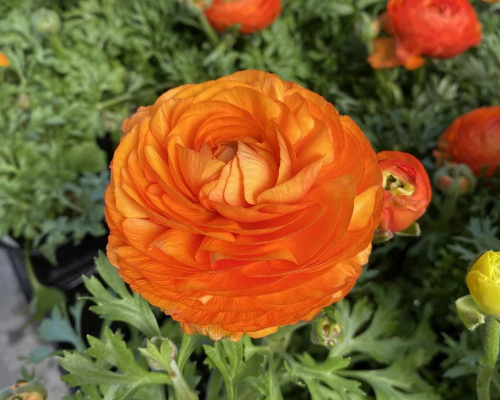 Ranunculus asiaticus 'Orange' je fascinujúca trvalka s plnými kvetmi sýto oranžovej farby. Kvety majú množstvo vrstvených okvetných lístkov, ktoré svojou bohatosťou pripomínajú pivónie alebo ruže. Svetlozelené laločnaté listy tvoria hustý trs, ktorý dokonale dopĺňa žiarivo oranžové kvety. Táto energická odroda prináša do záhrady živý a slnečný nádych.