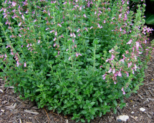 Poliehavý až polokerovitý druh s drobnými, lesklými, tmavozelenými listami, ktoré sú aromatické. Kvety sú ružovofialové, zoskupené v pazušných klasoch, majú nápaditú a príjemnú vôňu, lákajúce včely a iný hmyz. Rastlina vytvára hustý porast a je vhodná na tvarovanie.